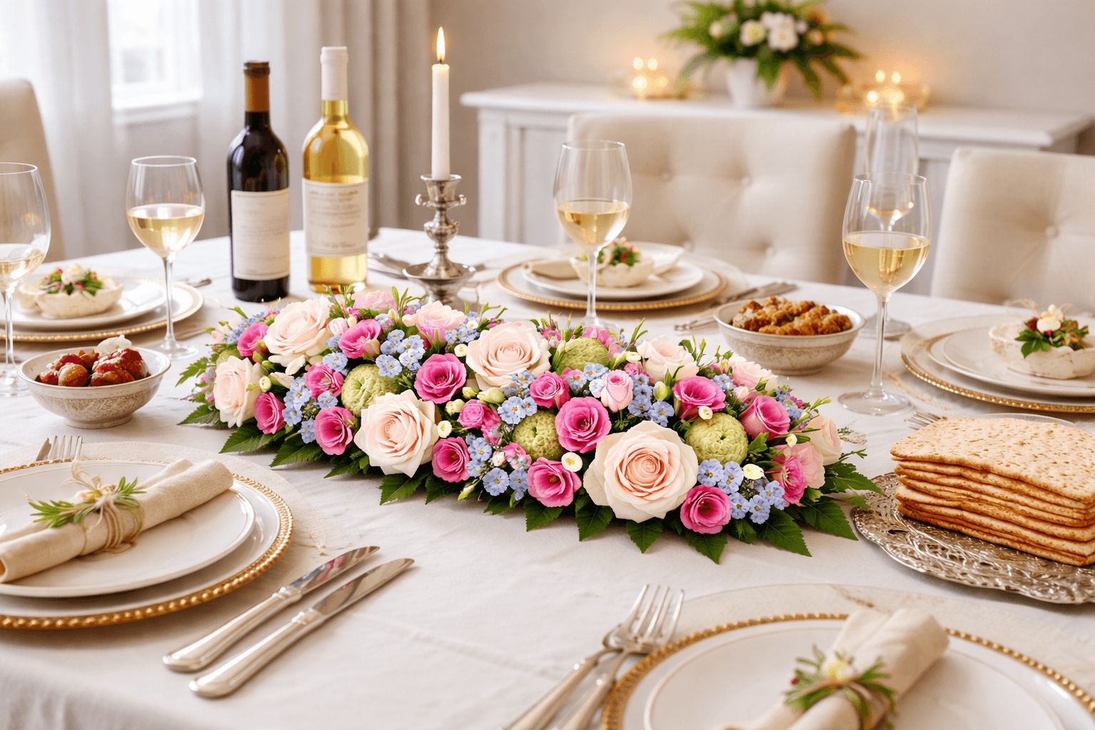 סידור פרחים מאורך ומרשים בגווני ורוד ולבן, המעניק לשולחן מראה חגיגי, אלגנטי ומוקפד.