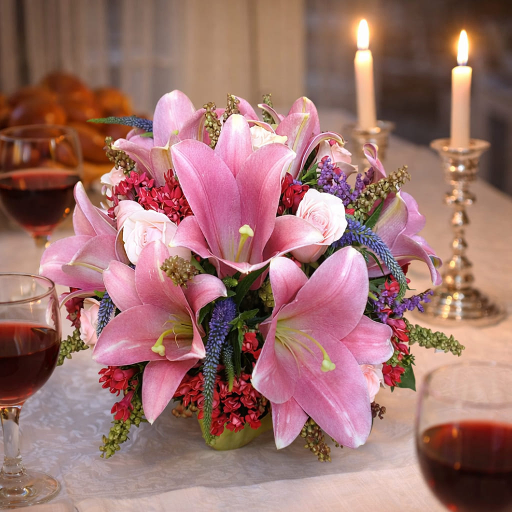 סידור פרחים אלגנטי ומרשים בגוונים ורודים ולבנים, המשלב ליליות ורודות, ורדים ופרחים עונתיים היוצרים מראה עשיר וחגיגי. הסידור מתאים במיוחד לשולחן שבת, לאירוח חגיגי או כמתנה מרשימה לבית. שילוב הפרחים הרעננים והגוונים העדינים מעניק תחושת חגיגיות ואווירה נעימה לכל שולחן.
