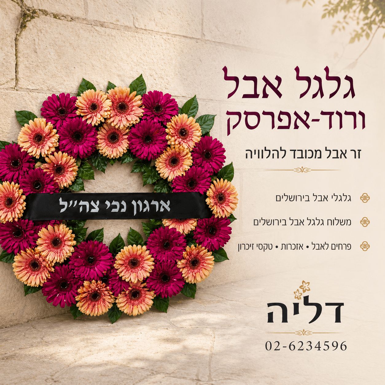 This wreath is suitable for funeral wreath delivery in Jerusalem and the surrounding area, for families, institutions, organizations, and official bodies. A personalized sympathy ribbon can be added upon request.