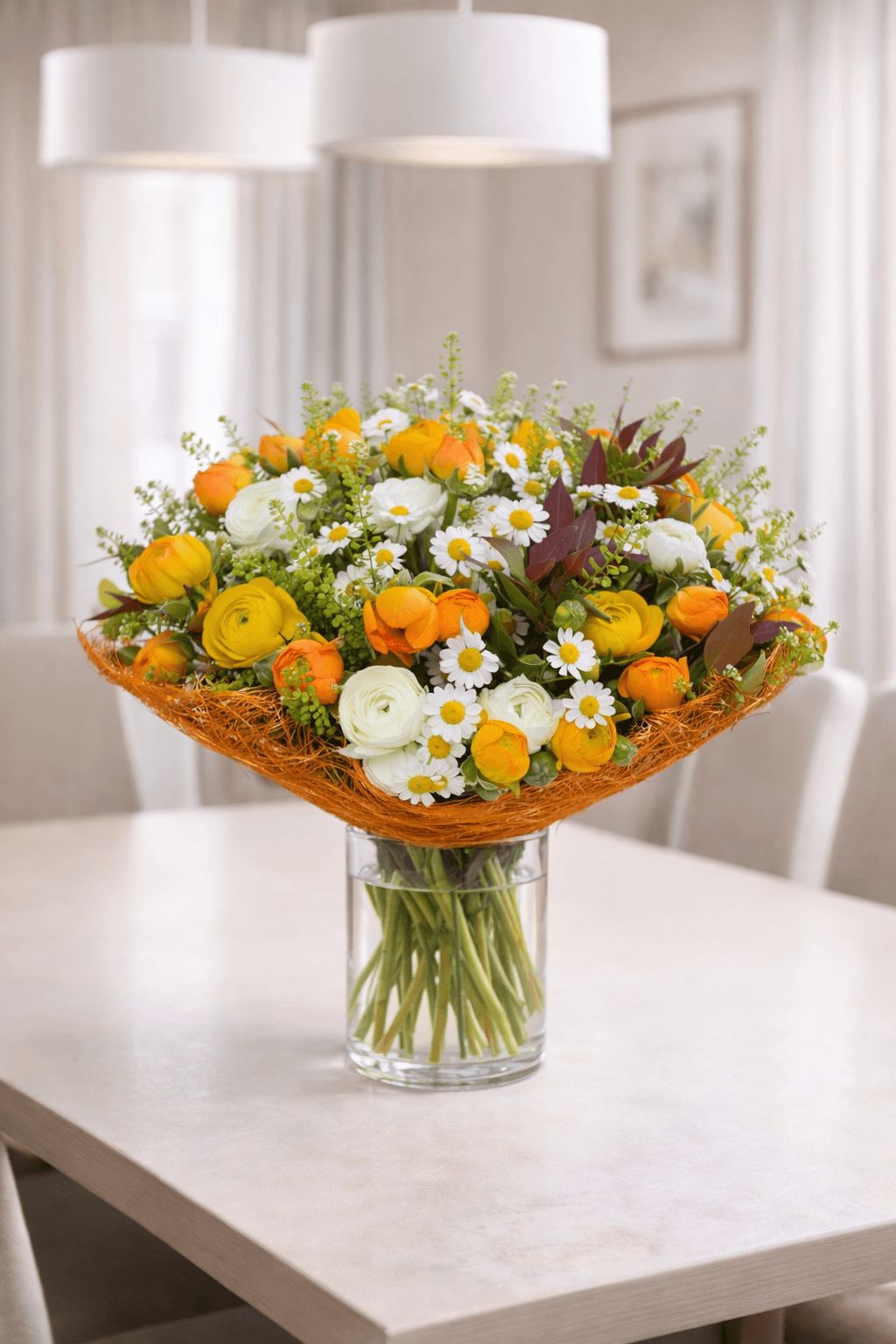 זר פרחים מרהיב בגוונים חמים של כתום, לבן ונגיעות ירוק רענן, המשלב פרחי עונה כמו נוריות (Ranunculus), חרציות עדינות וירק משלים ליצירת מראה עשיר, טבעי ומלא חיים.